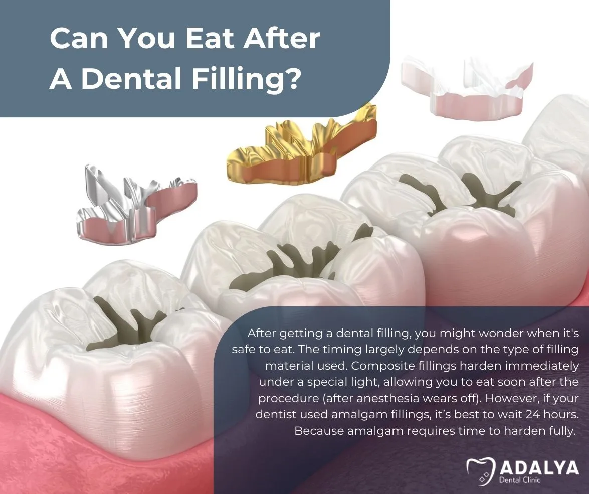 One of the most common questions after getting a dental filling is whether you can eat immediately. The timing largely depends on the type of filling material used.