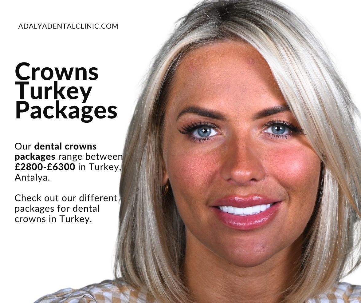 Dental crowns packages in Turkey are all-inclusive dental restoration packages designed for those seeking affordable, high-quality zirconium, IPS E-Max, and ZirCAD crown treatments, and prices range between £2,800–£7,000 ($3,700-$9,300), depending on the type of crown and the number of teeth.